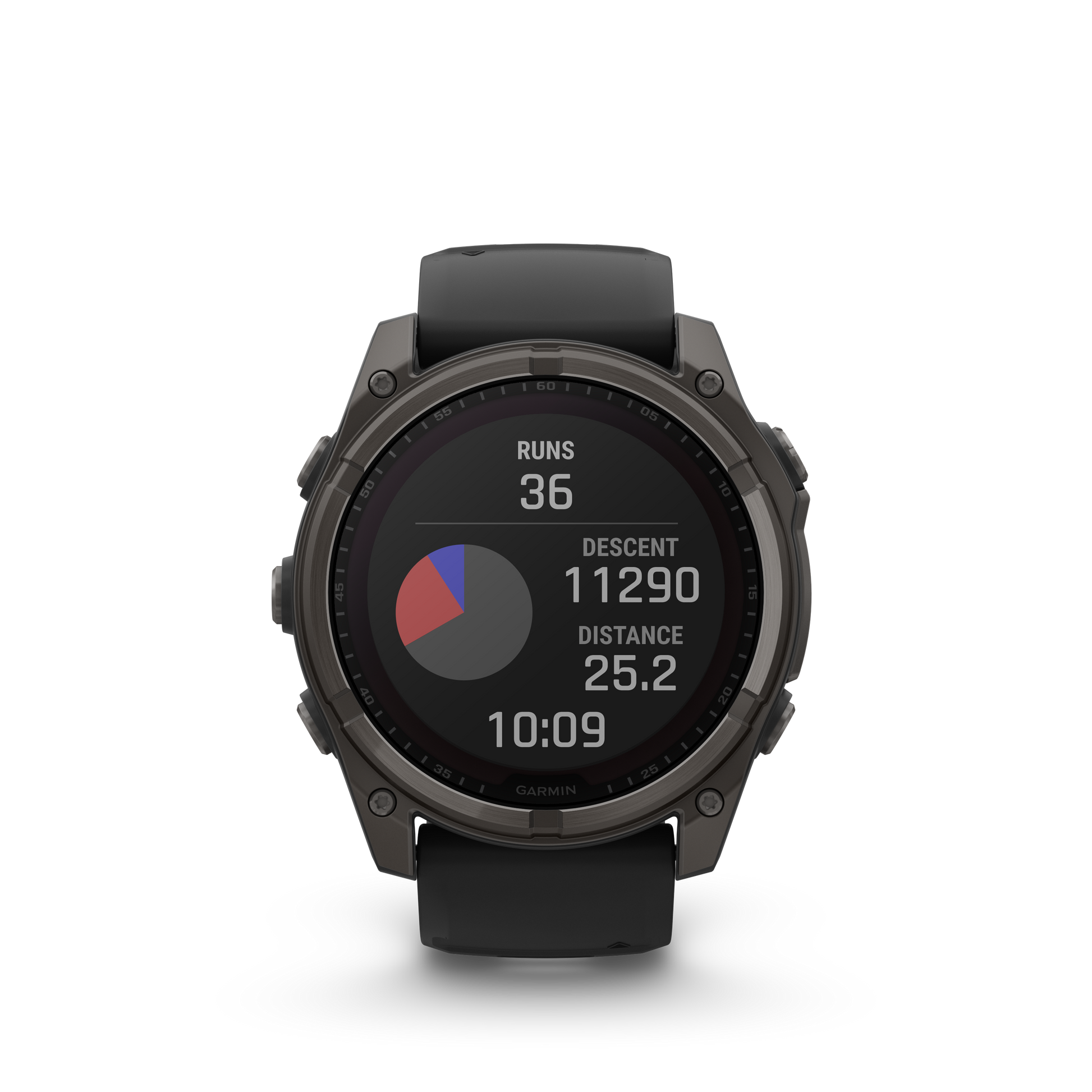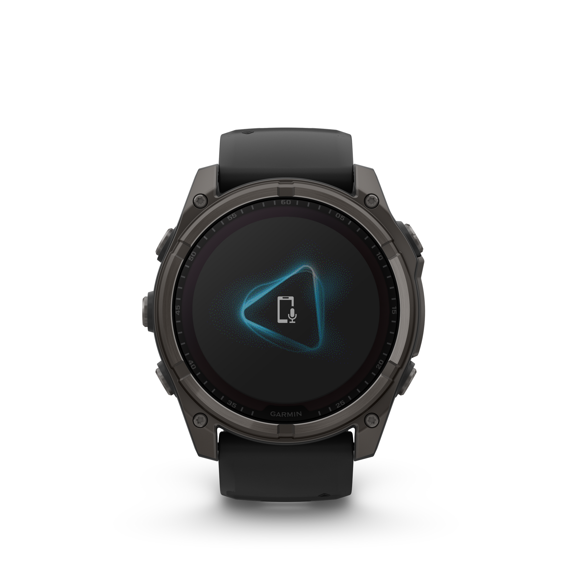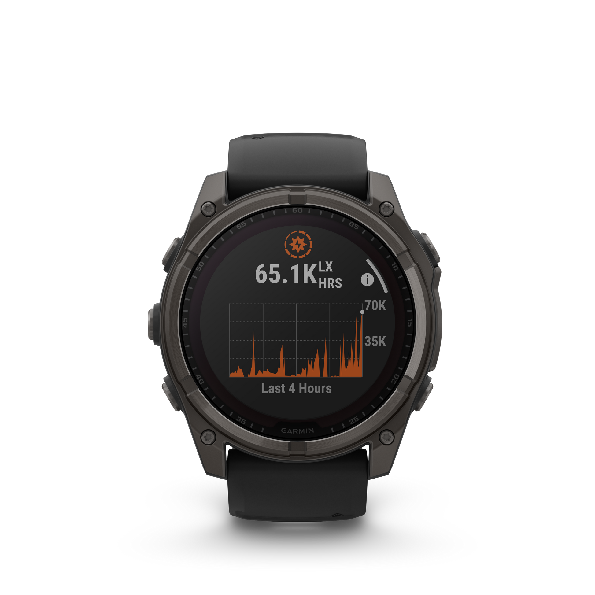 The f?nix® 8 multisport GPS smartwatch is built for serious athletes and outdoor adventurers who want to push beyond their limits. It features a 1.3” solar charged display with scratch-resistant sapphire lens, durable titanium bezel and powerful built-in LED flashlight for after-dark visibility. A built-in speaker and mic enable you to make and take calls from your wrist when your watch is paired to your smartphone. Power up your body’s performance, endurance and resistance to injury with targeted strength training plans and a full range of sport-specific workouts. Performance insights help manage your exertion and build stamina, while training readiness features show how much recovery time you need between workouts, based on 24/7 health and wellness monitoring of heart rate, respiration, stress, sleep and more (data presented is intended to be a close estimation of metrics tracked). Take to the trails with built-in ABC sensors and preloaded TopoActive maps. The dynamic round-trip routing feature helps simplify the planning of your runs or rides — letting you set your target distance and receive turn-by-turn directions that adjust to get you back to your start on schedule. Enjoy extended off-grid adventures with solar power providing up to 92 hours of battery life in GPS mode (assumes continuous use for entire period in 50,000 lux conditions). Plus, a 40-meter dive rating and leakproof metal buttons let you reach new depths of adventure. Additional features include music storage, Garmin Pay™ contactless payments (with a supported country and payment network), smart notifications (compatible smartphone required) and more.