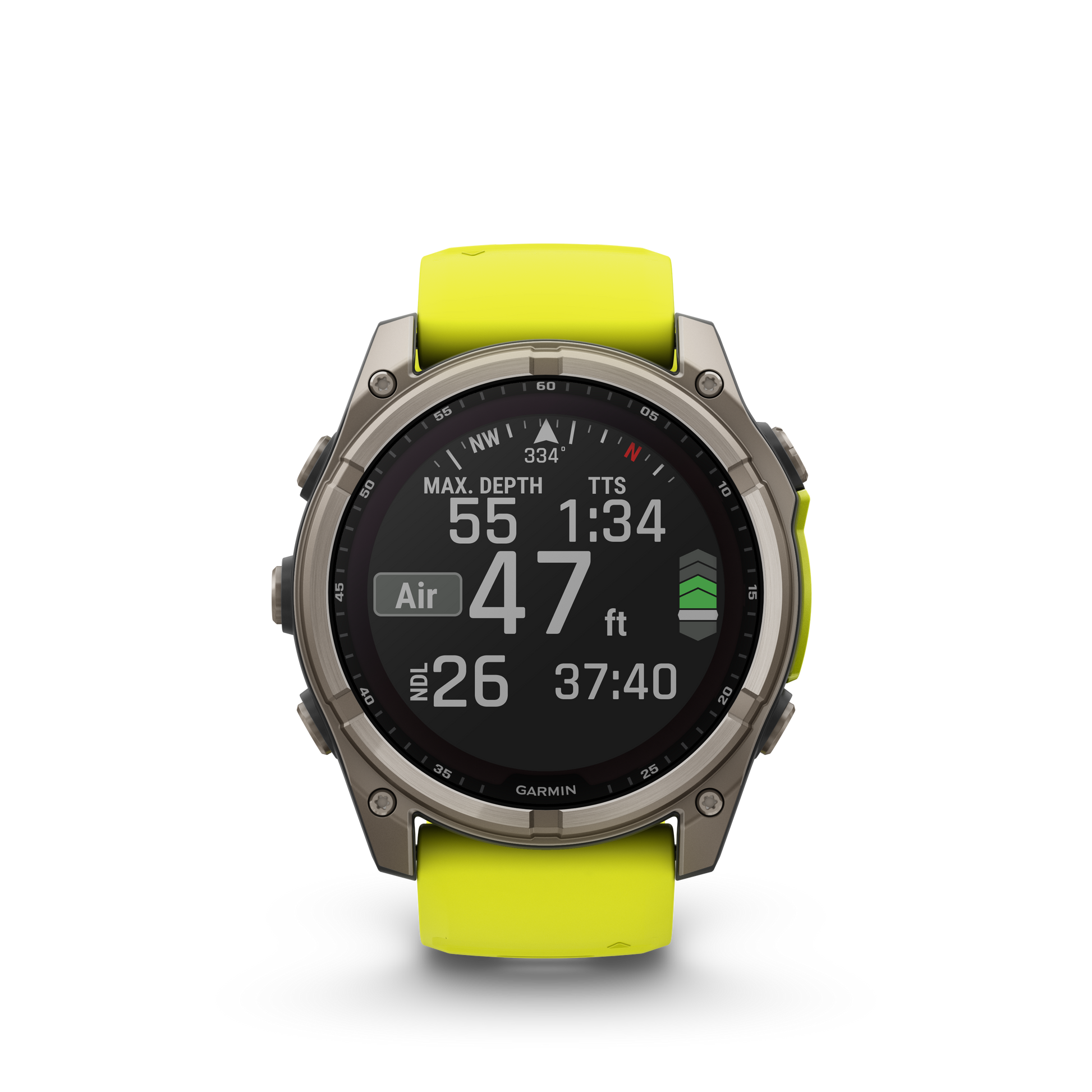 The f?nix® 8 multisport GPS smartwatch is built for serious athletes and outdoor adventurers who want to push beyond their limits. It features a 1.3” solar charged display with scratch-resistant sapphire lens, durable titanium bezel and powerful built-in LED flashlight for after-dark visibility. A built-in speaker and mic enable you to make and take calls from your wrist when your watch is paired to your smartphone. Power up your body’s performance, endurance and resistance to injury with targeted strength training plans and a full range of sport-specific workouts. Performance insights help manage your exertion and build stamina, while training readiness features show how much recovery time you need between workouts, based on 24/7 health and wellness monitoring of heart rate, respiration, stress, sleep and more (data presented is intended to be a close estimation of metrics tracked). Take to the trails with built-in ABC sensors and preloaded TopoActive maps. The dynamic round-trip routing feature helps simplify the planning of your runs or rides — letting you set your target distance and receive turn-by-turn directions that adjust to get you back to your start on schedule. Enjoy extended off-grid adventures with solar power providing up to 92 hours of battery life in GPS mode (assumes continuous use for entire period in 50,000 lux conditions). Plus, a 40-meter dive rating and leakproof metal buttons let you reach new depths of adventure. Additional features include music storage, Garmin Pay™ contactless payments (with a supported country and payment network), smart notifications (compatible smartphone required) and more.
