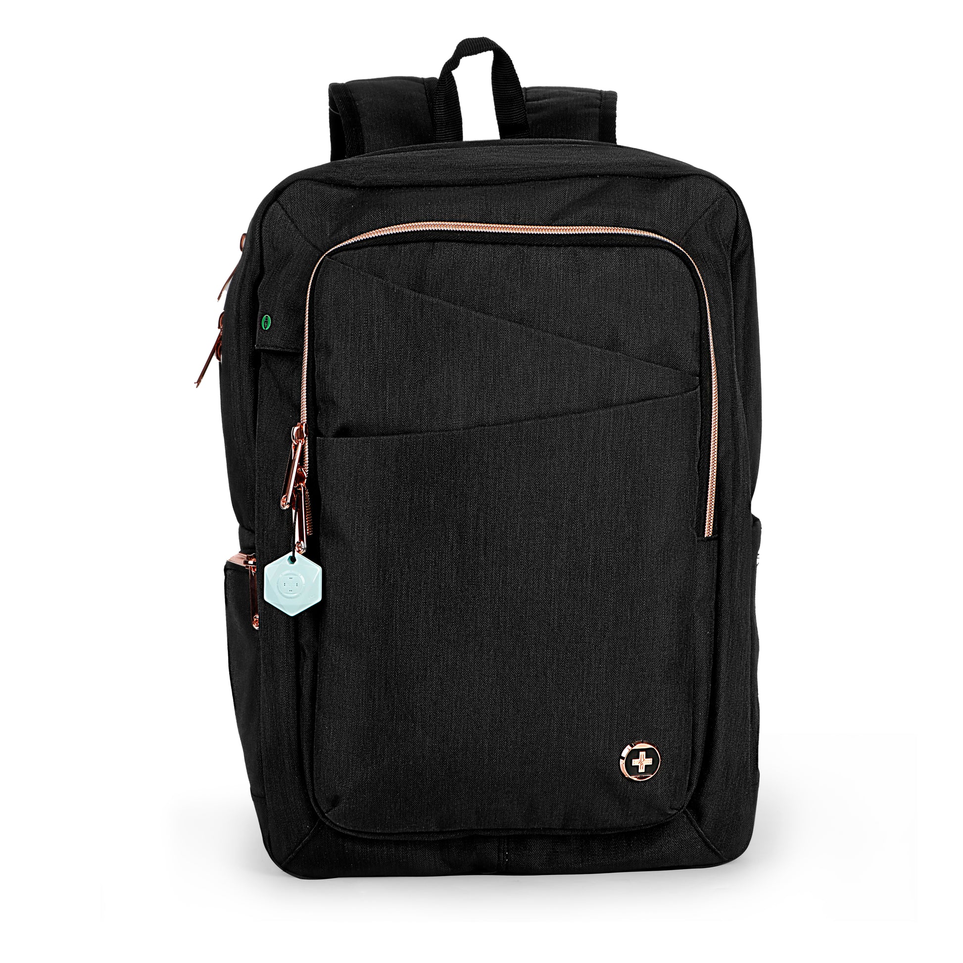 KATY ROSE is a stylish black Laptop backpack with rose accents. The bag is perfect for students and professionals. Travel with peace of mind with a built in an integrated RFID protection compartment. Two-year limited warranty on non-electrical componets.