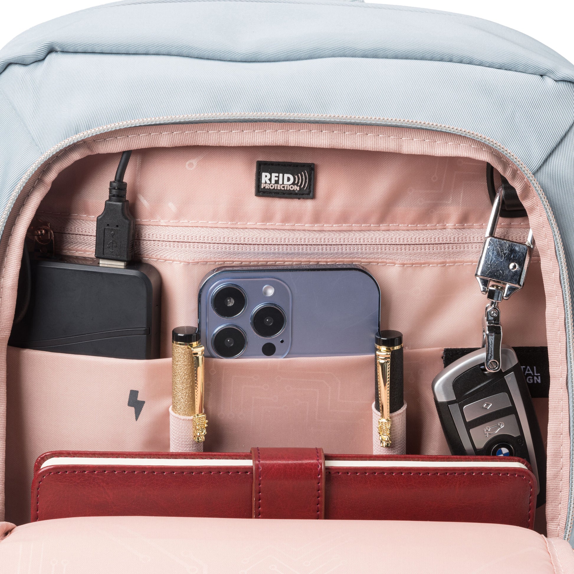 -RFID DATA PROTECTION: Travel with peace of mind. The integrated RFID protection compartment protects your personal data (e.g. credit cards, passports and driver’s licenses) from being accessed by RFID scanners.